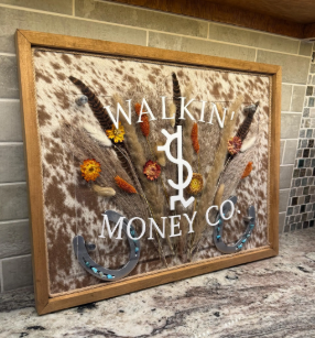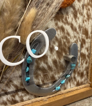 Customizable Western Acrylic Wall Sign, Cowhide Ranch Decor, Rustic Cowboy Western Wall Art. Cow hide, horseshoes, turquoise stones, and flowers behind acrylic on a wood frame.